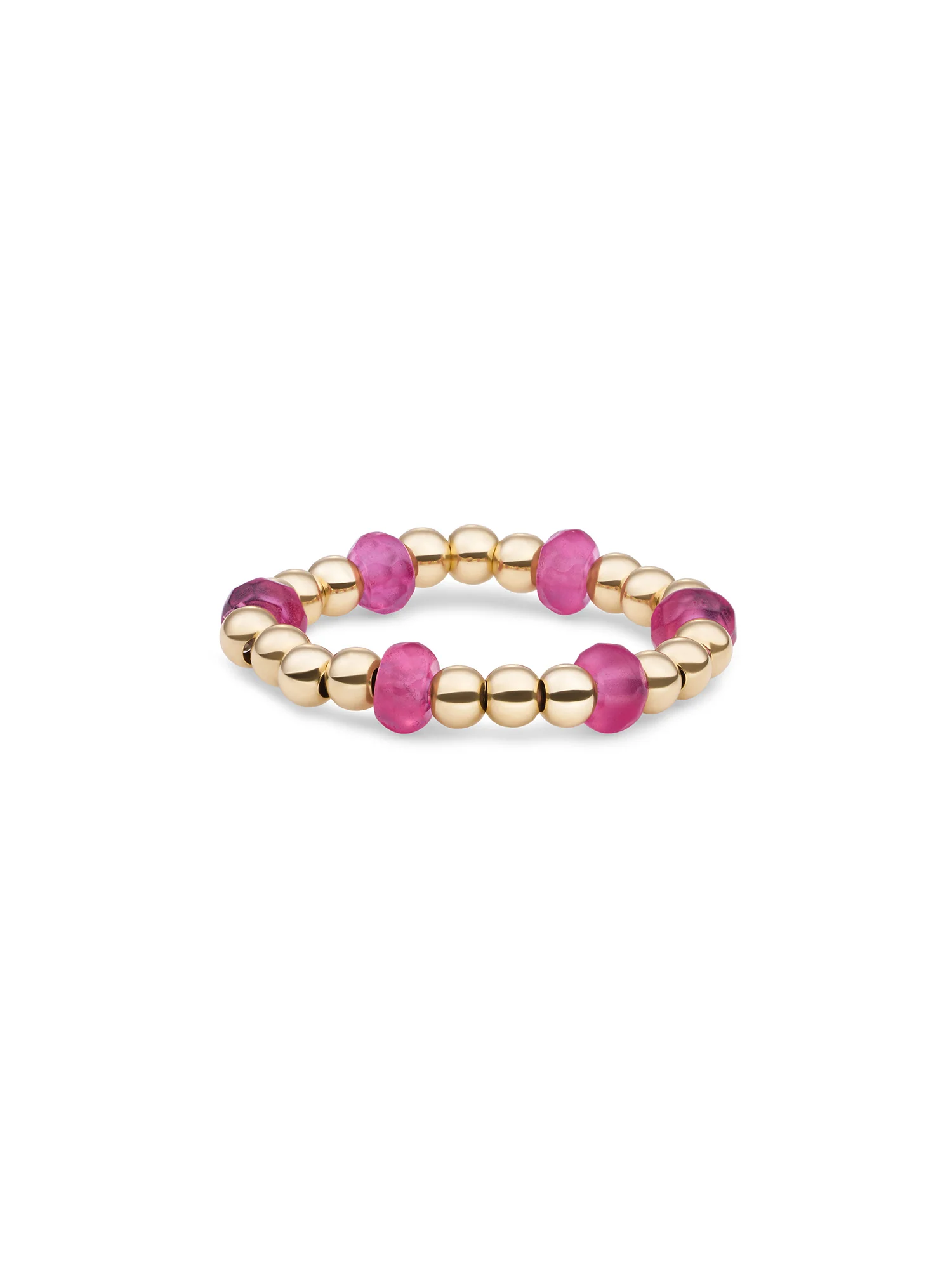 Ring mit facettierten, runden Perlen aus Candy-Jade. Dieser Ring vereint Farbe und Textur in einer luftigen Silhouette. Facettierte Rondelle fangen das Licht lebendig ein, während Candy-Jade Ihrer Hand einen frischen Glanz verleiht. Das perlenbesetzte Profil ist geschmeidig und bietet auch nach langen Tagen angenehmen Tragekomfort. Tragen Sie ihn solo für minimalistische Klarheit oder kombinieren Sie ihn mit schmalen Ringen in Gold oder Silber für mehr Tiefe. Der Candy-Ton harmoniert mit neutralen Farben und bringt Denim zum Funkeln. Schwarz bildet einen modernen Kontrast. Integrieren Sie die Farbe dezent in Ohrringe oder einen Anhänger für ein stimmiges Ensemble. Eine zeitlose Wahl, die Ihrem Alltagsstil Saison für Saison einen Hauch von Strahlkraft verleiht.