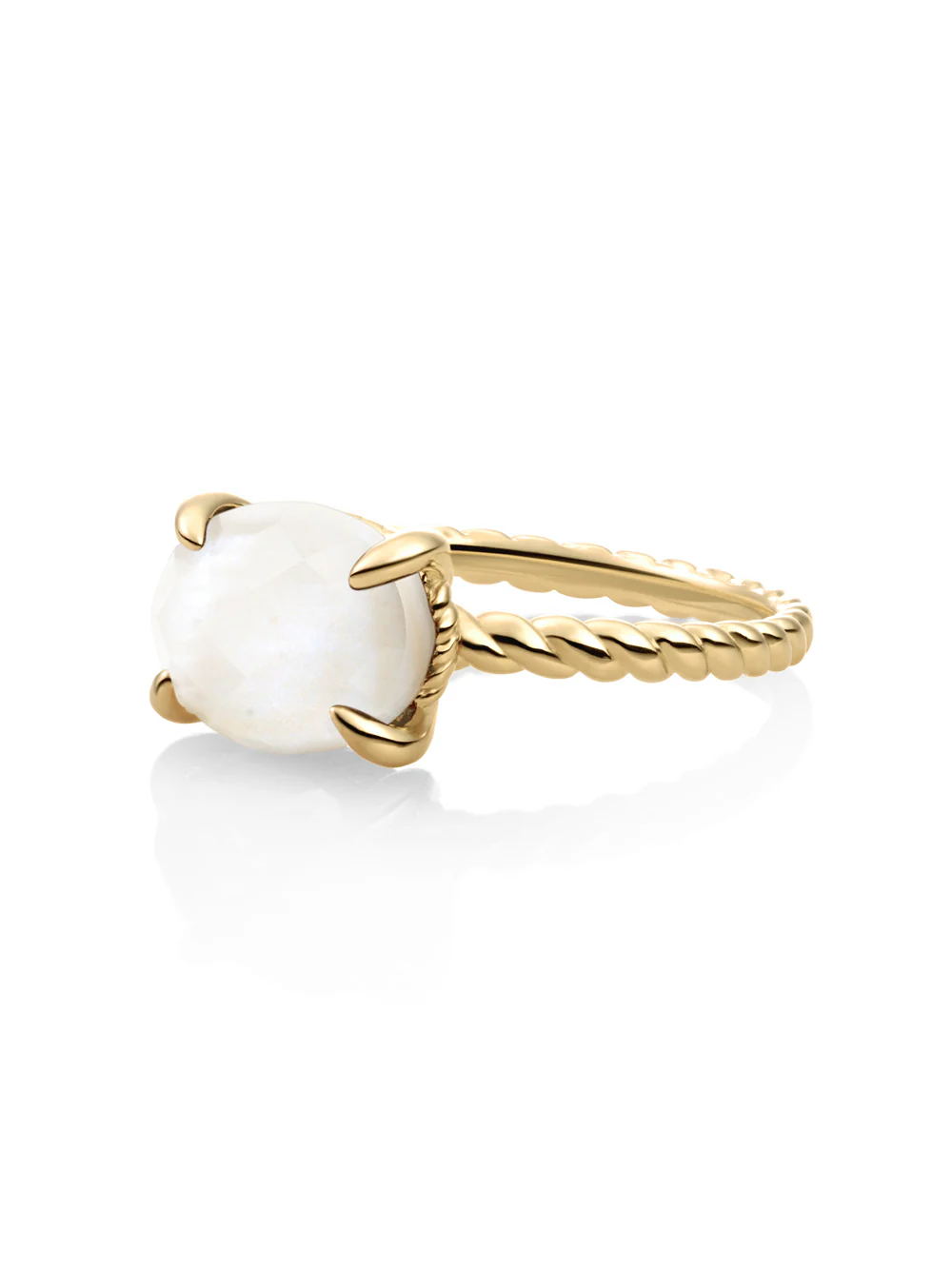 Charakteristisch für die Twist Ringe sind die runden Formen und das bekannte Twist Muster im Ring. Da unsere goldfarbenen Ringe aus 9 Karat gefertigt sind, verfärben sie sich nicht. Der Mother of Pearl Twist Ring ist ein goldfarbener Ring mit ovalem Stein aus Pearl Edelstein.