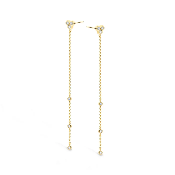 Alma Hanger, der mit seiner langen, eleganten Kette und feinen Zirkoniensteinen bei jeder Bewegung das Licht einfängt. Der Bügel besteht aus 925 Sterling Silber und ist mit 18 Karat Gold plattiert.