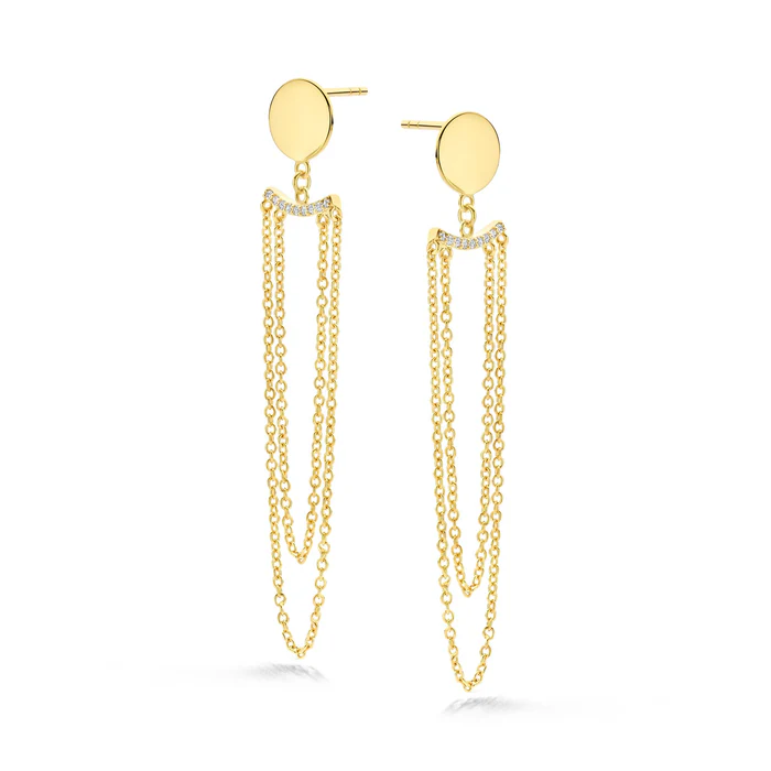 Der Dancer Hanger hat einen leichten und eleganten Look, bei dem die feine Kette ein lebendiges Spiel erzeugt und deinem Look Bewegung verleiht. Der Bügel besteht aus 925 Sterling-Silber, versilbert mit 18 Karat Gold, und ist wunderschön mit mehreren Zirkoniasteinen verziert.