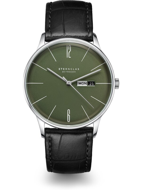- Olivegrünfarbenes, fein gewölbtes Zifferblatt, mit zarten, langen Indexen, arabische Zahlen 12 und 6, schmale Zeiger, Wochentag und Datum bei 3 Uhr, Sternglas Logo über dem Zeigersatz.