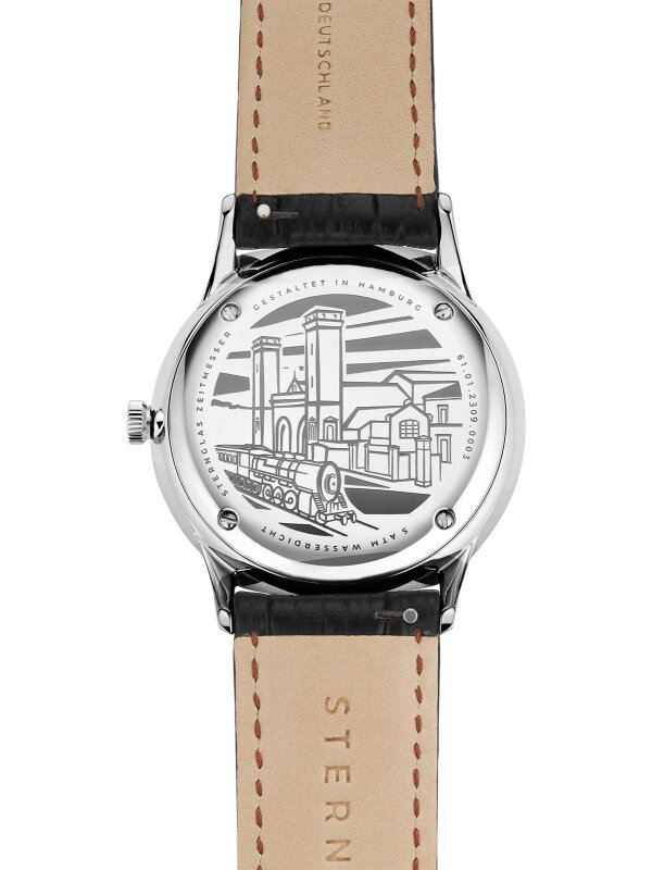 - 4-fach verschraubter Gehäuseboden mit Gravur des Berliner Bahnhofs in der Sternglas Heimatstadt Hamburg.