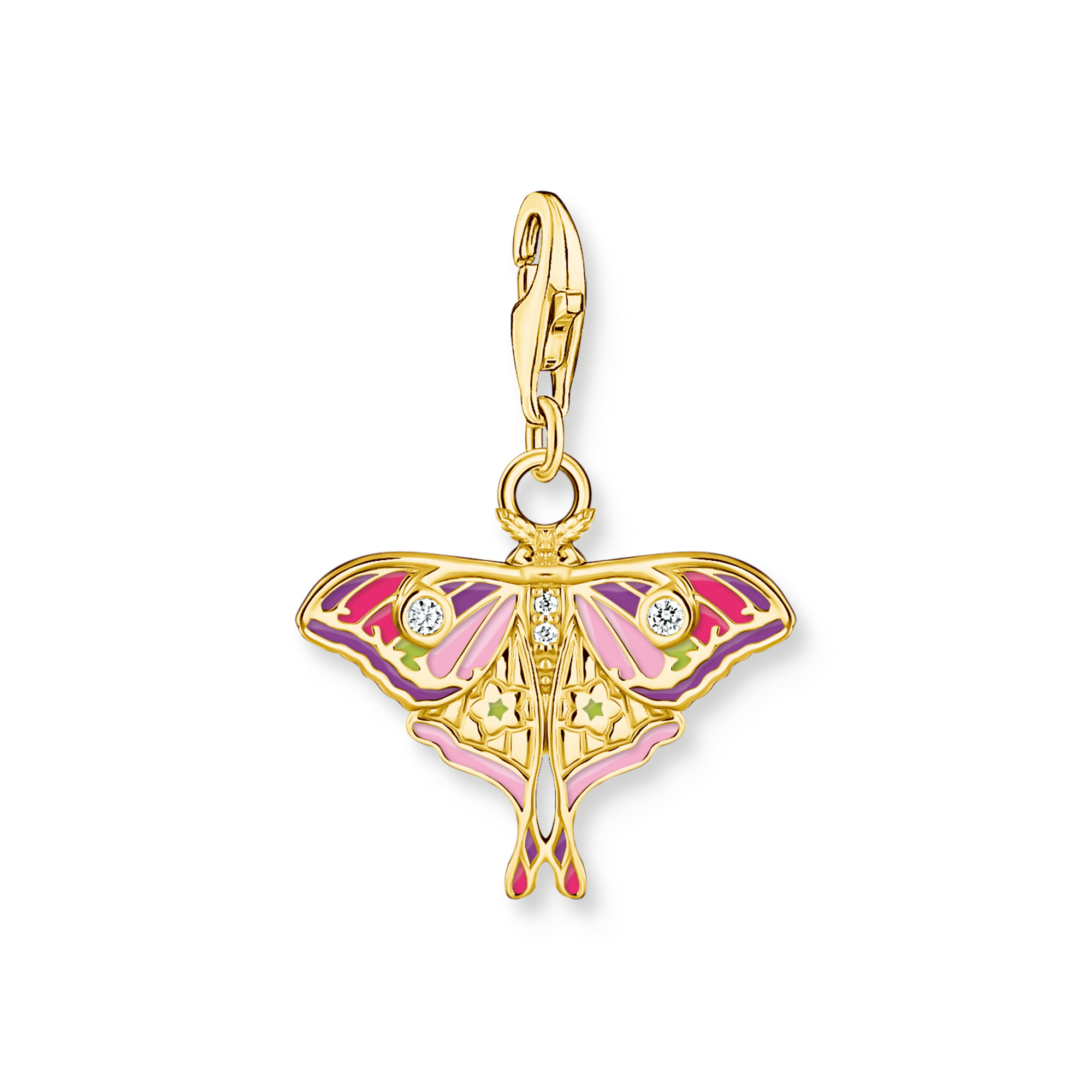 Ein fröhlicher Begleiter auf deiner Reise: Dieser Charm aus recyceltem Silber ist als bunter Nachtfalter gestaltet. Mit von Hand aufgetragener Emaille in Magenta, Limettengrün, Rosa sowie Lila sind die filigranen Flügel detailreich gearbeitet – so fliegt er mit dir wie in einem schönen Traum. Zirkonia-Steine in Weiß setzen funkelnde Akzente.