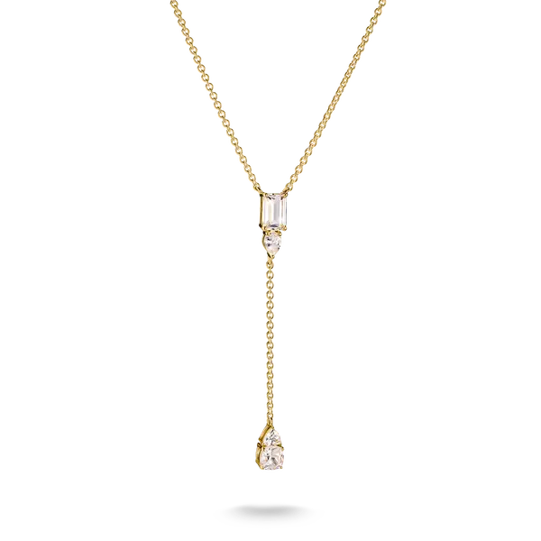 Die elegante Y-Silhouette streckt optisch den Hals, während weiße Zirkoniasteine in Oktagon-, Tropfen- und Trillantschliff das Licht eindrucksvoll reflektieren. Ob als dezenter Begleiter im Business oder als glänzendes Detail zum Abend-Outfit – dieses Collier lässt dich strahlen und wirkt dabei stets stilvoll zurückhaltend.