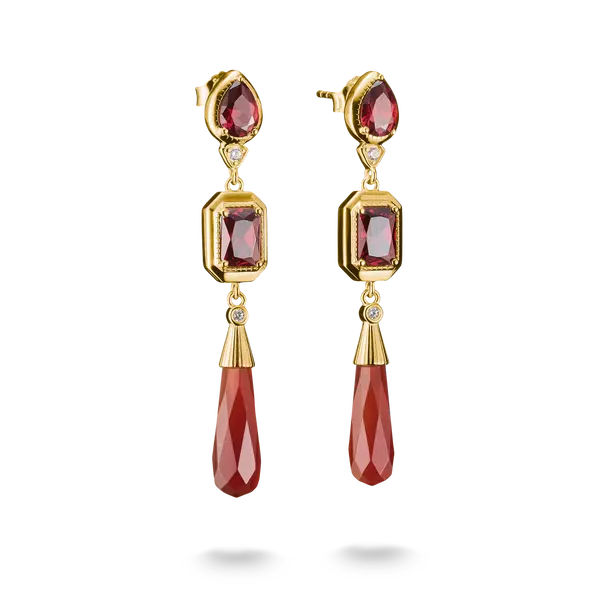 Warme Tiefe trifft leuchtende Präzision: Facettierter granatroter Zirkonia in Oktagon- und Cabochonschliff führen das Auge zu einem roten Achat-Tropfen – Symbol für Kraft und vitale Ausstrahlung. Verschiedene Schliffe erzeugen ein lebendiges Spiel aus Licht und Bewegung, während die 18k Vergoldung einen edlen Rahmen schafft. Teil der Elyndra Kollektion, begleitet dich dieses Paar bei Auftritten, die Stärke, Sinnlichkeit und Stil selbstbewusst vereinen.