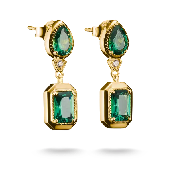 Zart und doch präsent: Ein smaragdgrüner Tropfenstein führt das Auge zu einem tief leuchtenden Oktagonstein im selben Farbton, dazwischen bringt ein kleiner, rundgeschliffener Zirkonia Bewegung ins Spiel. Das Wechselspiel klarer Formen und raffinierter Schliffe verleiht den Elyndra-Ohrhängern moderne Eleganz mit femininer Ausstrahlung – perfekt für stilvolle Everyday-Looks oder besondere Momente.