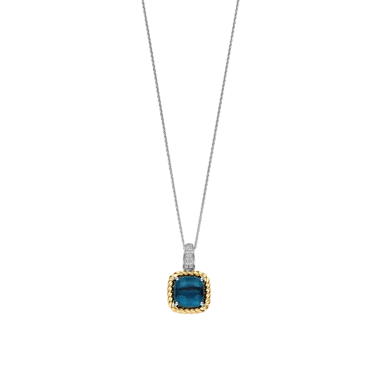 Hinterlasse einen mutigen Eindruck mit diesem TI SENTO vergoldeten silbernen Anhänger 6853DB. Gefertigt aus 925 Sterlingsilber, zeigt das Design einen kissenförmigen Stein in durchscheinendem Dunkelblau – dezent facettiert für sanfte Reflexionen und Tiefe. Der Mittelstein ist in einer verdrehten gelb-goldenen Zackenfassung gebettet, was Struktur und vintage-inspirierten Charme verleiht. Ein platinplattiertes Bail-Pavé-Set mit brillant geschnittenem weißen Zirkonia rundet den Look ab und fängt bei jeder Bewegung das Licht ein. Allein oder in Lagen getragen, bietet dieser Anhänger einen satten Farbakzent mit zeitloser Eleganz. Nickelfrei und hypoallergen sorgt es für langanhaltenden Komfort und einen strahlenden Stil. Der Anhänger wird mit einer zarten silbernen Kettenkette geliefert.