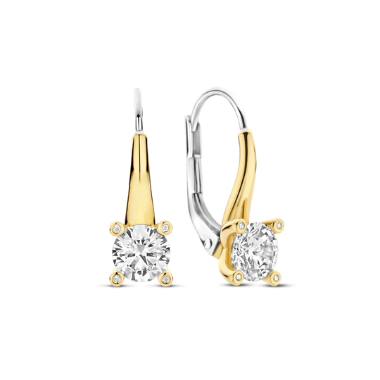 Diese Ohrringe aus hochwertigem 925er Sterlingsilber sind mit einer strahlenden Gelbgoldbeschichtung versehen und zeigen einen brillanten, runden Zirkonia-Schliff, der zart in einer zeitlosen vierzackigen Fassung gehalten ist, um sein funkelndes Funkeln zu verstärken. Sie sind an schlanken, vergoldeten Leverback-Haken aufgehängt und bewegen sich mühelos mit Ihnen und sorgen gleichzeitig für einen sicheren und bequemen Sitz