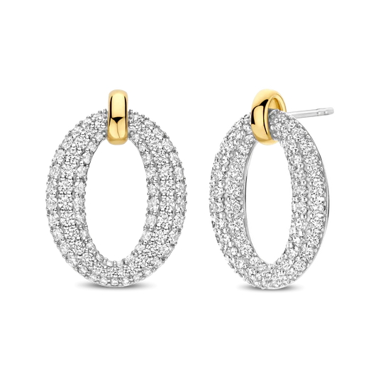 Diese Ohrringe aus hochwertigem 925er Sterlingsilber verfügen über ein elegantes, gelbvergoldetes Glied, das elegant an einer funkelnden ovalen Form schwebt und ein dynamisches Zusammenspiel von Texturen und Oberflächen erzeugt. Der Kontrast zwischen warmen Goldtönen und schimmernden Pavé-Details macht diese Ohrringe zu einem auffälligen und dennoch zeitlosen Statement.