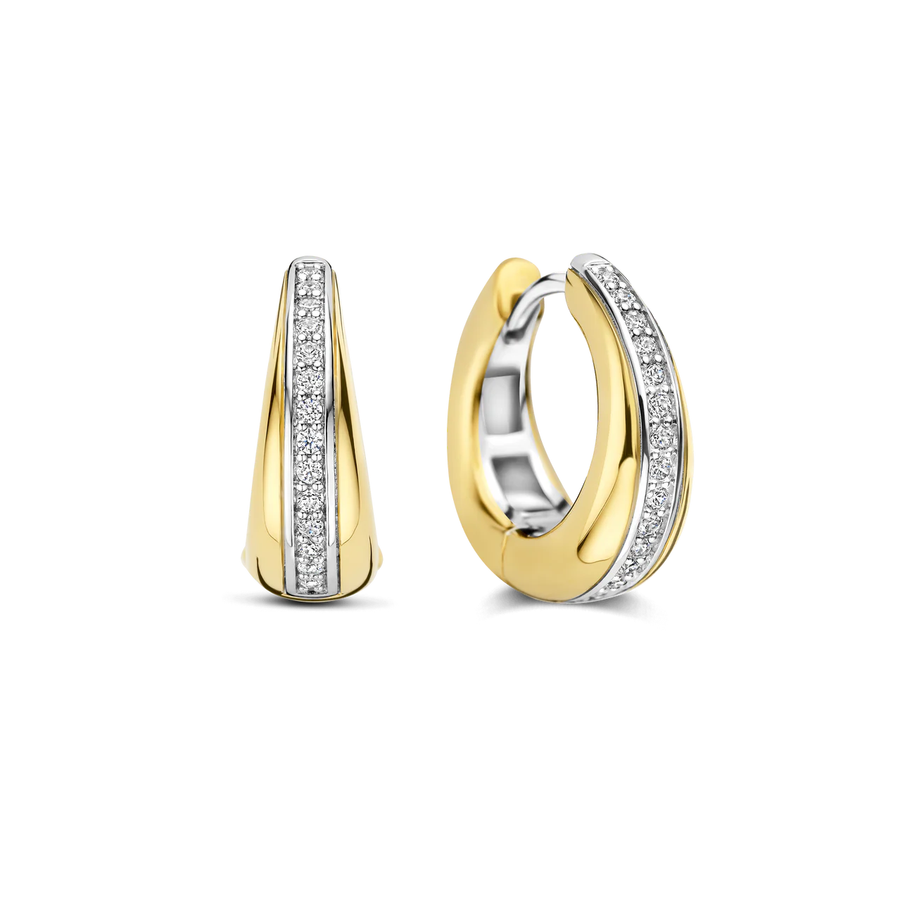 Das geschichtete Design verleiht diesen 18-karat-goldenen Vermeil-Zirkonia-Ohrringen ein modernes und luxuriöses Gefühl mit zusätzlicher Tiefe. Die Kombination aus der schlanken goldfarbenen Oberfläche und dem funkelnden Zirkonia macht diese Creolen zu echten Statement-Ohrringen, während ihre Größe sie ideal für den Alltag macht. Perfekt zum Alleintragen oder mit anderem vergoldetem oder zirkoniafarbenem Schmuck. 78049ZY Circles & Cross-over Ohrringe