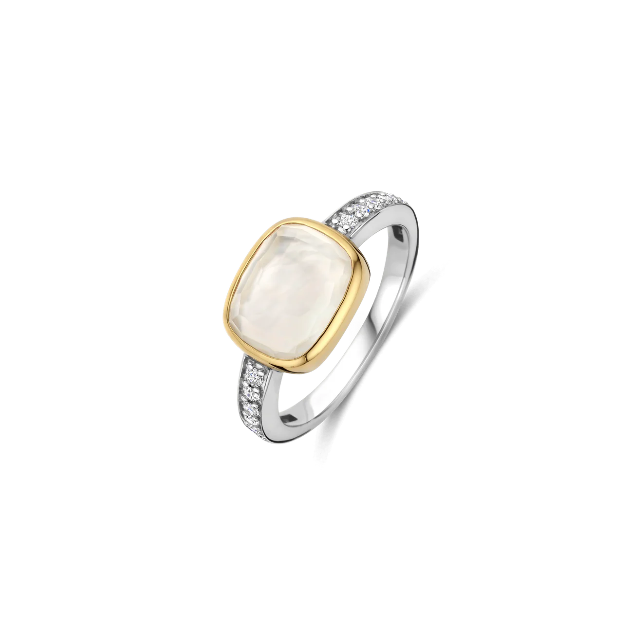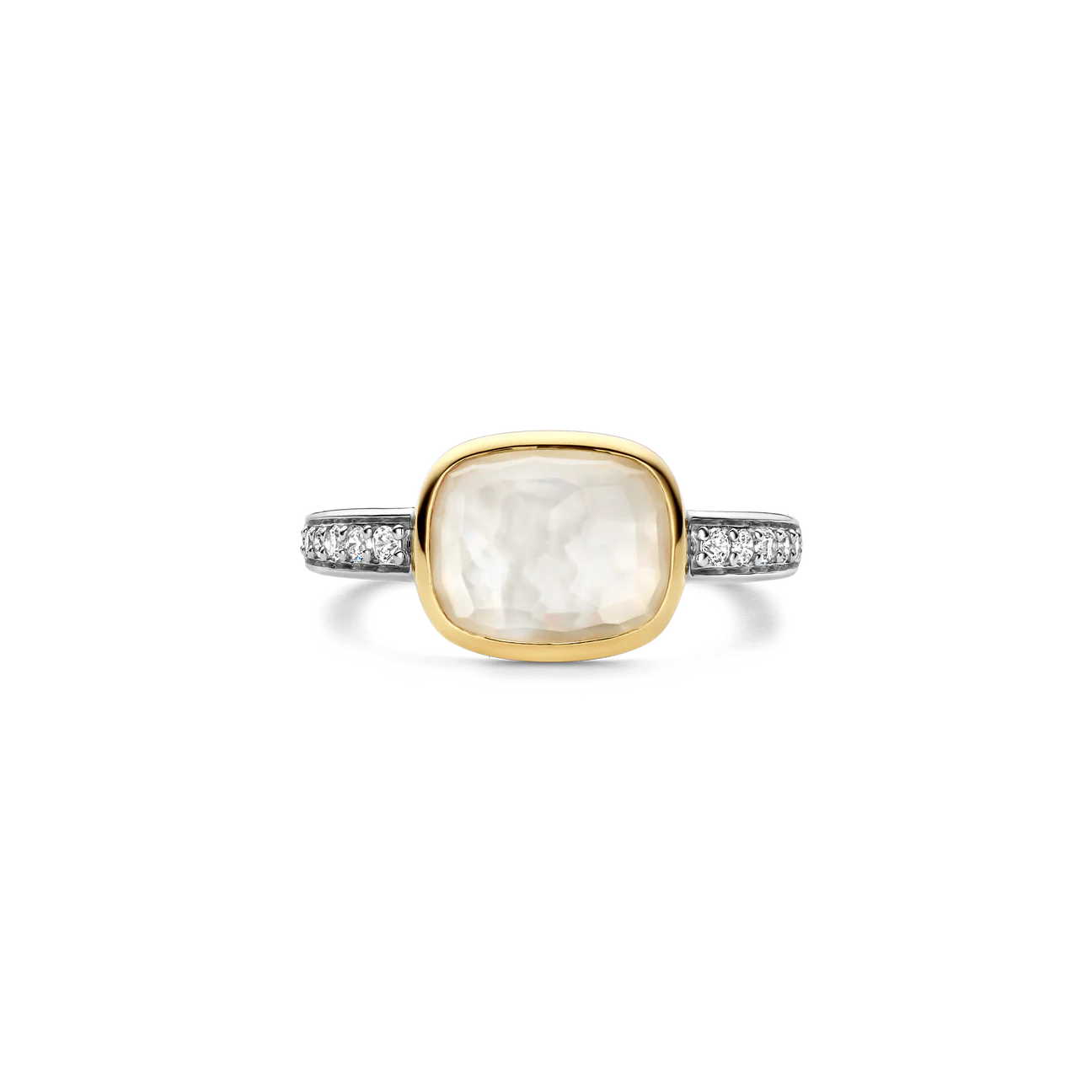 Verleihen Sie diesem vergoldeten Silberring 12398MW von TI SENTO einen Hauch von weicher Ausstrahlung. Dieses elegante Design aus 925er Sterlingsilber verfügt über einen kissenförmigen Perlmuttstein, der in eine glatte, gelbvergoldete Lünette eingefasst ist, die den natürlichen Glanz unterstreicht. Das platinierte Band ist mit einem Pavé besetzt und verfügt über weiße Zirkonia im Brillantschliff an den Schultern, die einen raffinierten Kontrast zwischen Glanz und Glanz schaffen. Zart und doch unverwechselbar, geht dieser Ring mühelos vom Alltag zur abendlichen Raffinesse über. Nickelfrei und hypoallergen, sorgt es für luxuriösen Komfort bei jedem Tragen.