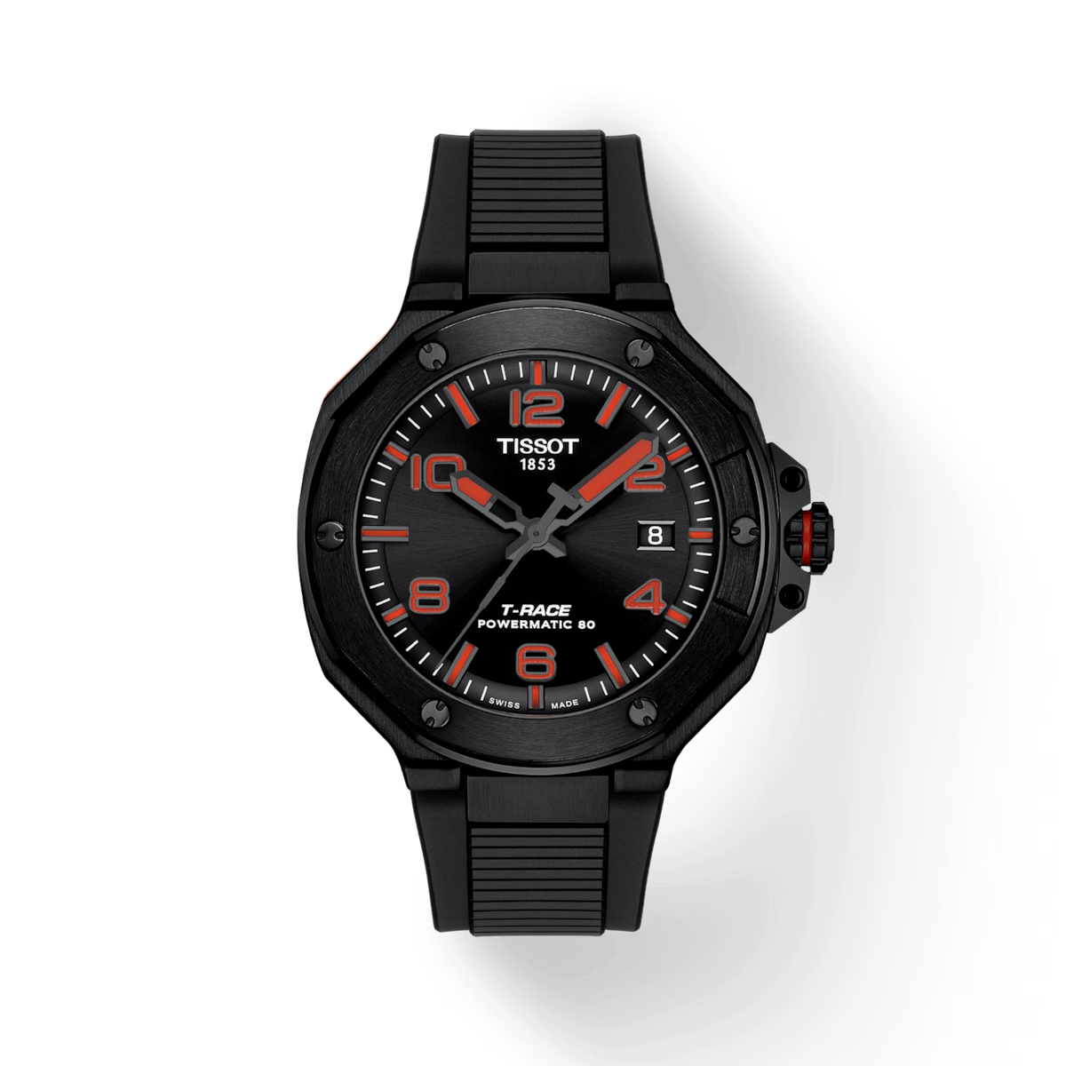 Diese Version der Tissot T-Race Powermatic 80 verfügt über ein 41 mm-Gehäuse aus 316L-Edelstahl mit schwarzer PVD-Beschichtung sowie ein schwarzes Zifferblatt mit roten Zeigern und Ziffern im Startnummern-Look. Das kratzfeste Saphirglas garantiert eine erhöhte Robustheit. Durch den gläsernen Sichtboden lässt sich das Powermatic 80 Werk bei seiner unermüdlichen Arbeit beobachten. Ein sportliches, schwarzes Silikonarmband mit schwarzer Dornschließe rundet den markanten Look ab.